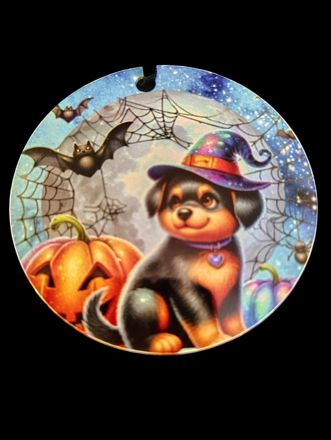 Celebrate the spooky season with this charming sublimation ornament featuring an adorable puppy dressed in a witch hat. Behind the playful pup, a glowing Jack-o’-lantern sets a festive tone, surrounded by fluttering bats, intricate cobwebs, and a radiant full moon. Perfect for Halloween décor or as a whimsical gift, this ornament brings a delightful blend of cuteness and classic Halloween spirit to any setting. Handcrafted with attention to detail, it’s a unique way to add warmth and charm to your holiday celebrations.