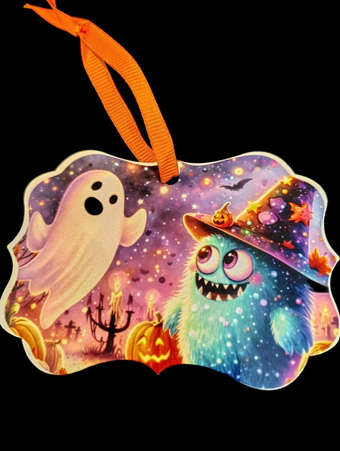 Celebrate the spooky season with this charming sublimation ornament, showcasing a playful ghost and a furry blue monster with googly eyes, donning a whimsical witch hat. Set against a starry night sky, the scene is complete with a glowing Jack-o'-lantern in the background. Perfect for adding a touch of fun and festive spirit to your Halloween decorations or as a unique gift for lovers of all things cute and spooky. Each ornament is carefully crafted to capture the joyful essence of the season, blending whimsy and Halloween tradition in a delightful keepsake.