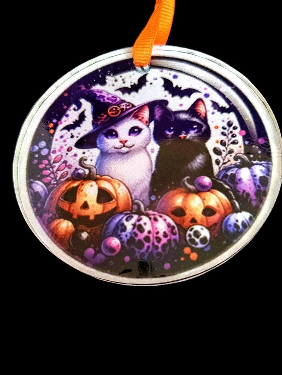 Celebrate the spooky season with this charming sublimation ornament featuring a black and white cat. The white cat sports a classic witch hat, adding a playful touch to the design. In front of the cats, bright Jack o’ lanterns glow warmly, while bats flutter in the background, enhancing the Halloween spirit. Perfect for adding festive charm to your holiday décor or gifting to cat lovers who enjoy a touch of spooky fun. Handcrafted with care, this ornament brings a blend of nature-inspired whimsy and seasonal cheer to any space.